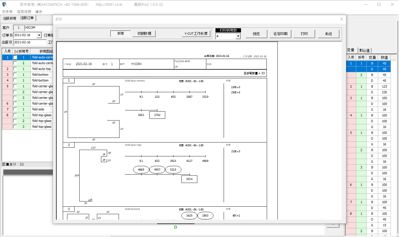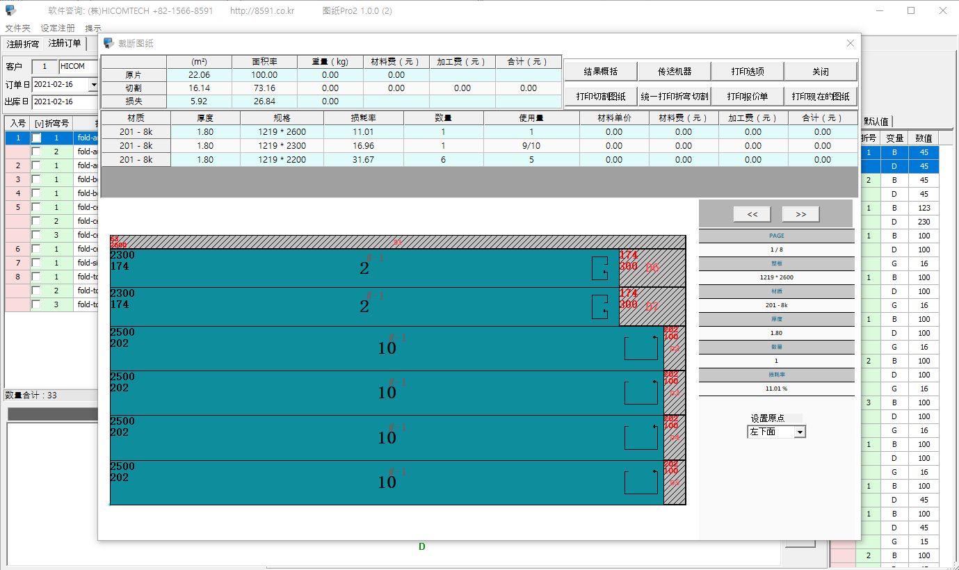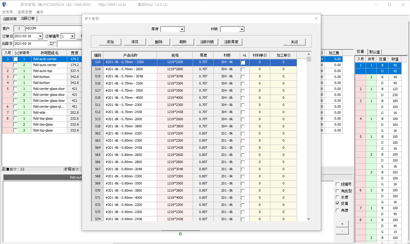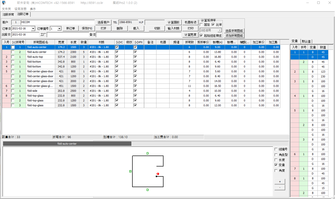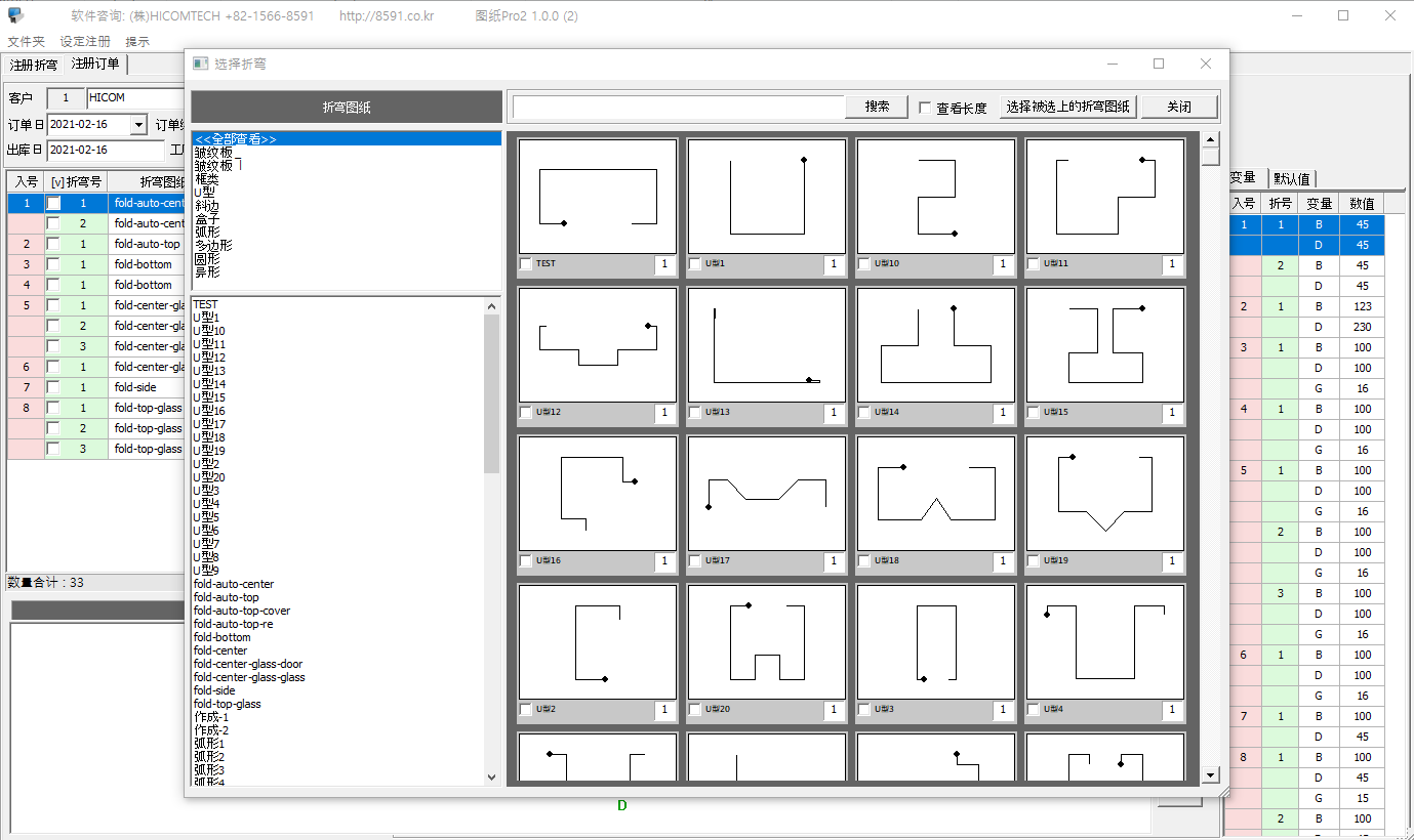 绘制以及管理金属折弯图纸, 按照长度和数值实时图形变化, 计算刨槽长度,计算折弯产品的面积以及周边, 算出不锈钢原片使用量以及做最合适的配置等是最合适与加工不锈钢/窗户单种公司的软件. [注册订单][选择折弯图纸][裁剪图纸][注册原片][打印]